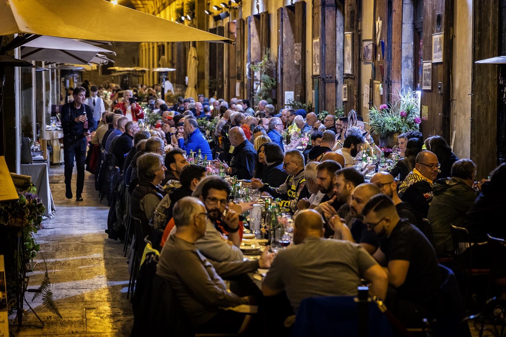 Per la cena, nuovamente ospitata nel cuore di Arezzo, sotto le logge del Vasari, la pioggia ha fatto la sua comparsa impedendo l’esibizione del gruppo storico della Giostra del Saracino, con sbandieratori e musici. Il porticato ha però accolto tutti i partecipanti, diventando il teatro ideale di un briefing approfondito, tenuto da Daniele Alessandrini e da Luca Viola, responsabile dei percorsi. Sullo sfondo, un’atmosfera di allegria ma anche di impazienza per la partenza ormai imminente, con la qualità della cena a fare da ulteriore biglietto da visita dell’evento.