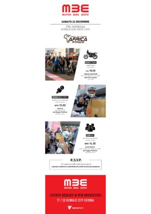 La giornata del 22 dicembre sarà interamente dedicata alla presentazione dell’Africa Eco Race 2019, che si svolgerà dal 17 al 20 gennaio a Verona per quanto riguarda la parte espositiva legata al Motor Bike Expo. Nel piazzale del PalaExpo, affacciato su viale del Lavoro, verrà allestita l’area in cui saranno accolti piloti, team e mezzi partecipanti alla competizione.