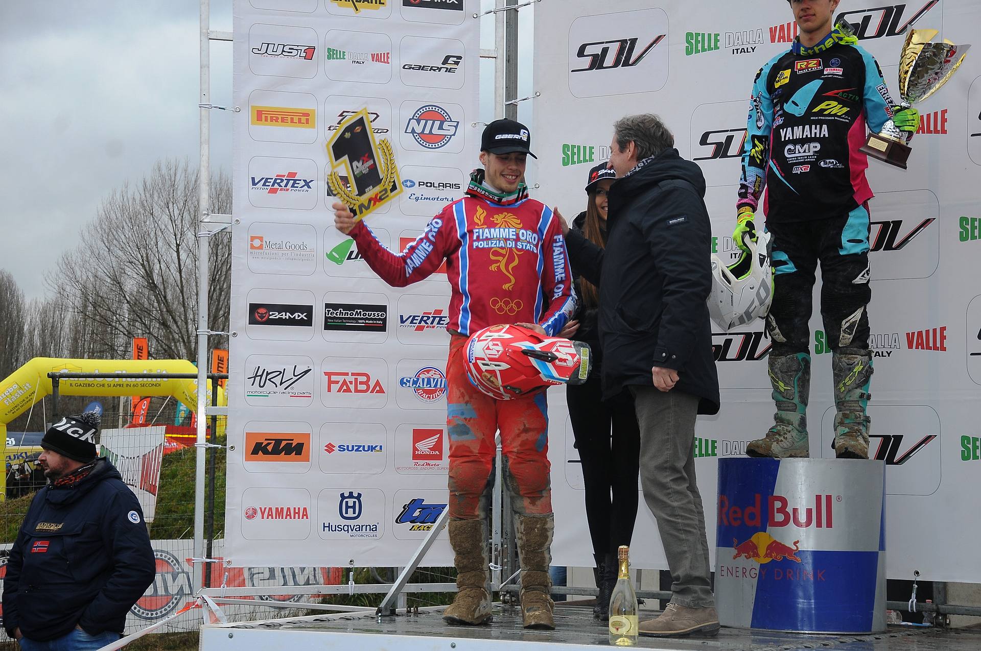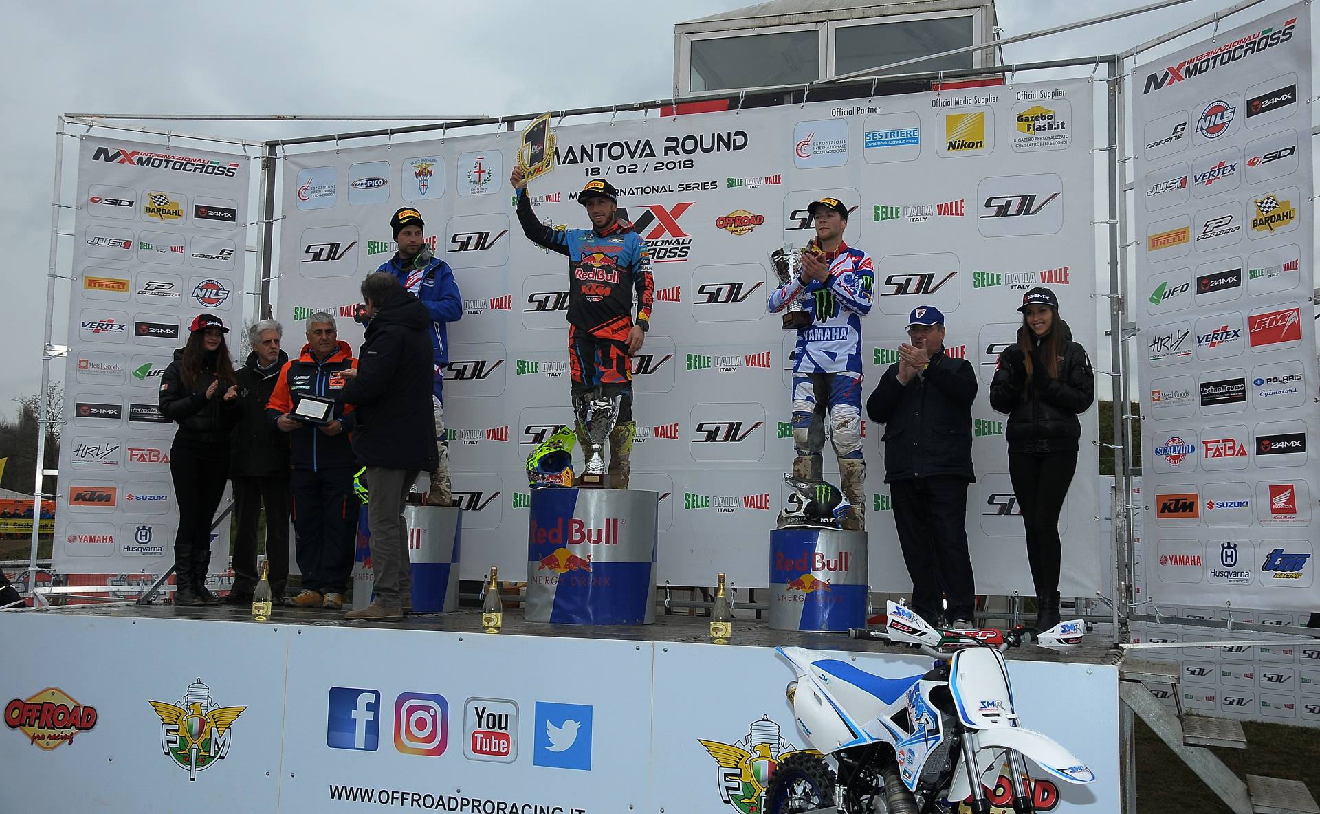 La MX1 ha visto il dominio di Cairoli, scattato in testa e mai realmente impensierito nel corso dei 13 giri. Il nove volte iridato ha imposto il proprio ritmo su un fondo insidioso, chiudendo con oltre cinque secondi di margine su van Horeebek (Yamaha) e Febvre (Yamaha), e assicurandosi così la corona di Campione Internazionale MX1. Più sfortunata la prova del campione del mondo 2016 Tim Gajser (Honda HRC), al debutto stagionale: lo sloveno è caduto duramente alla curva Gaerne e, trasportato in ospedale, ha riportato una ferita all’arcata dentale inferiore e un taglio al mento.