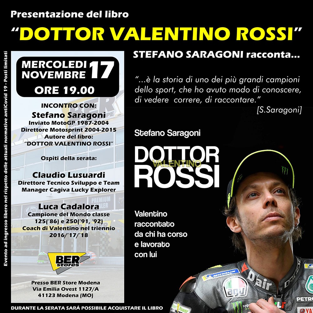 Stefano Saragoni, inviato in MotoGP dal 1987 al 2004 ed ex direttore di Motosprint fino al 2015, ha costruito il volume partendo dai racconti di chi ha condiviso box, tracciati e momenti chiave della carriera del Dottore. La presentazione al BER Store offrirà al pubblico alcuni assaggi delle storie contenute nel libro, oltre alla possibilità di acquistare il volume direttamente in serata.