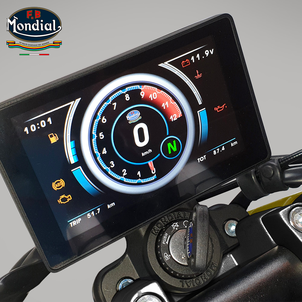 La dotazione tecnologica compie un salto in avanti con l’introduzione della strumentazione digitale TFT da 7 pollici. Il display offre regolazione automatica della luminosità giorno/notte e layout personalizzabile, elementi che la avvicinano a moto di categoria superiore per livello percepito e facilità di lettura delle informazioni.