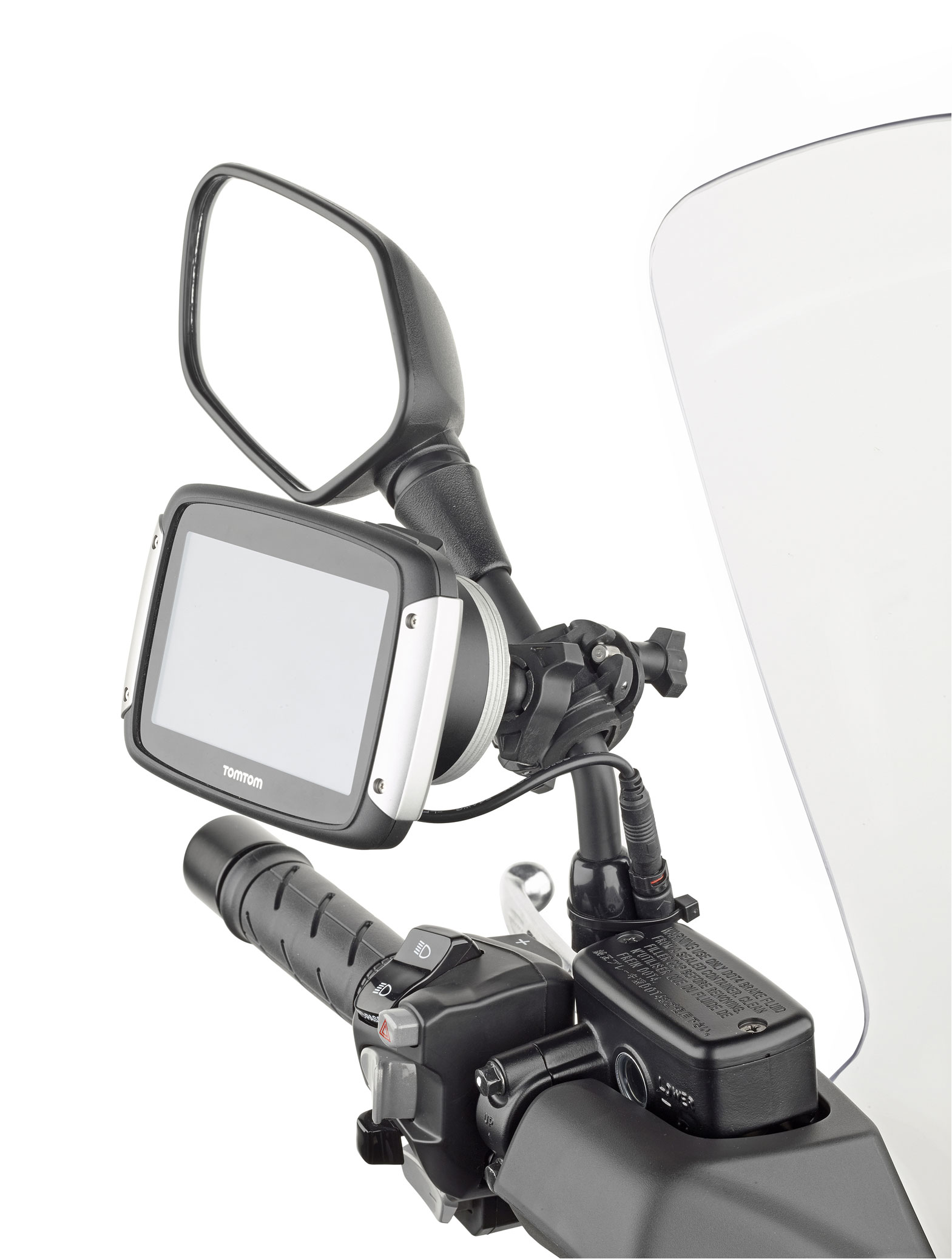 Non tutte le moto e gli scooter offrono lo stesso spazio in zona manubrio, e GIVI ha previsto opzioni alternative per venire incontro soprattutto ai possessori di scooter di grossa cilindrata. In questo caso il punto di fissaggio non è il manubrio, ma lo stelo dello specchietto retrovisore, sfruttato come base per il montaggio del GPS.