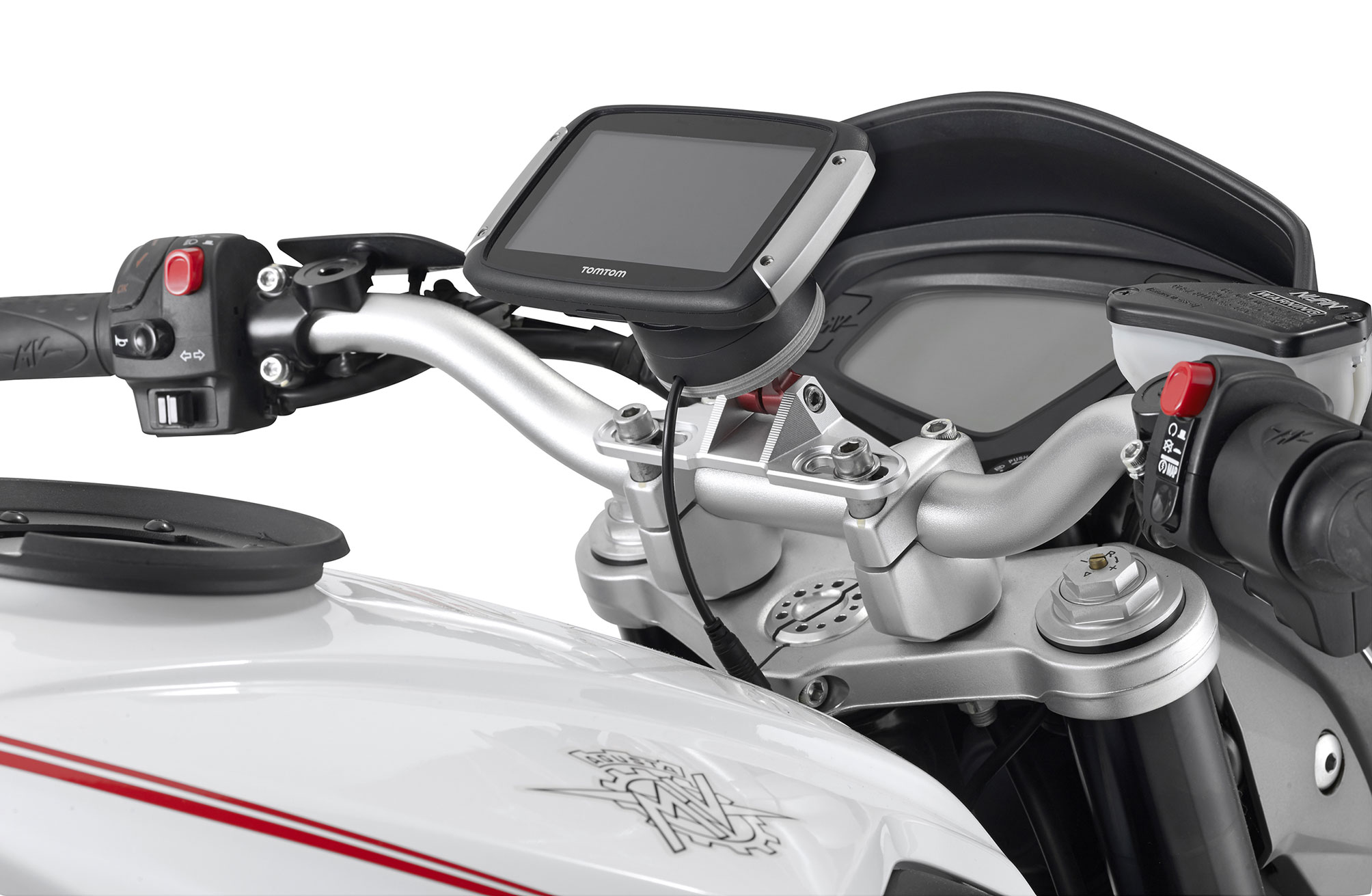 Chi invece ha scelto un TomTom Rider può completare l’installazione con lo STTR40SM, anch’esso in alluminio anodizzato e sviluppato per integrarsi con i modelli Rider 40 e 400. La geometria del supporto è studiata per assicurare l’aggancio diretto e sicuro al corpo del navigatore, evitando adattatori improvvisati.