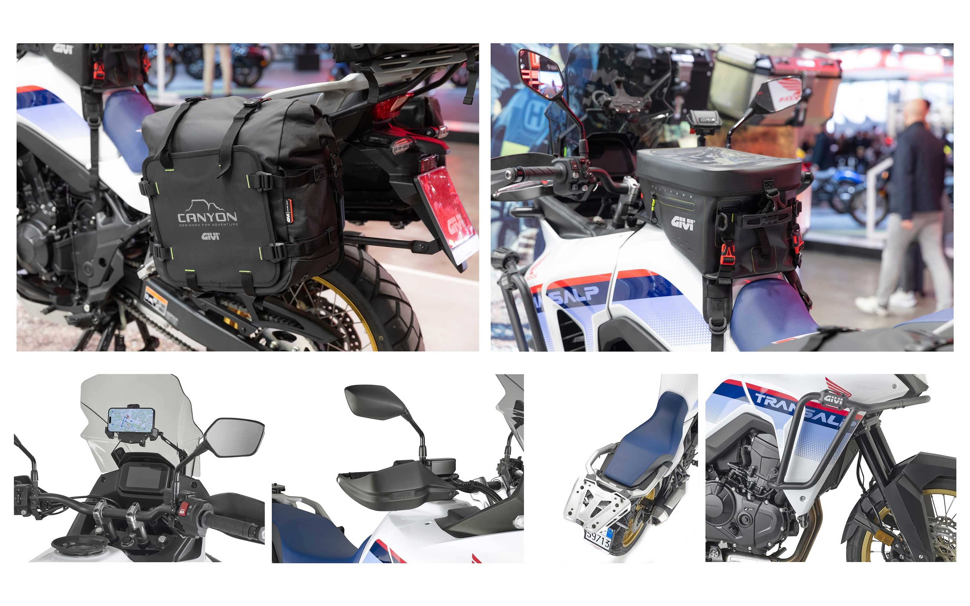 La Honda XL750 Transalp esposta allo stand Givi durante il Salone di Milano era equipaggiata con un set completo di borse Canyon, una famiglia di bagagli morbidi altamente tecnici progettati per affrontare ogni tipo di percorso, inclusi i tratti off-road più impegnativi.