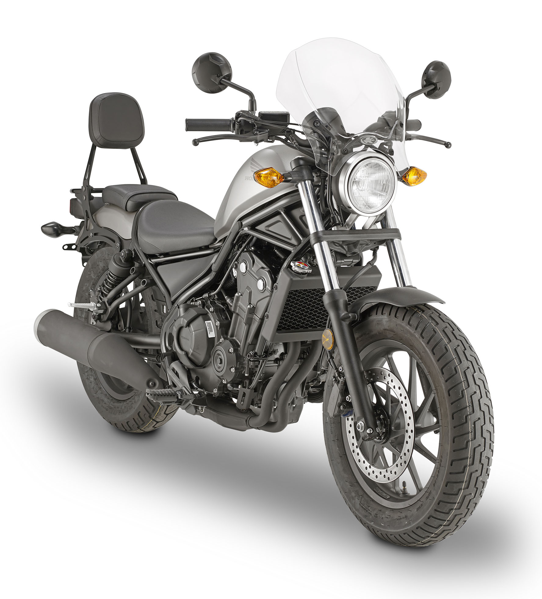 Per chi vuole aumentare anche la protezione aerodinamica, Kappa propone un kit di attacchi specifico, l’AL1160A, che consente di montare sopra il faro anteriore uno spoiler in alluminio, disponibile in finitura naturale o nera, con dimensioni contenute che rispettano l’estetica custom della moto. In alternativa è previsto un cupolino più protettivo, trasparente o fumé, con superficie maggiore per deviare meglio l’aria dal busto del pilota, soluzione ideale per chi utilizza la Rebel su percorsi extraurbani o autostradali.