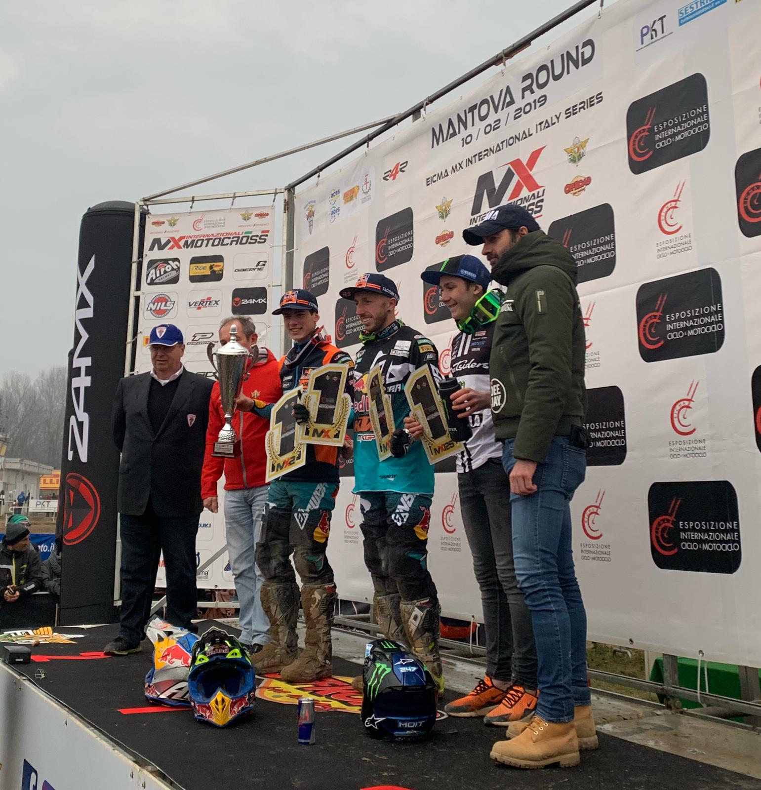 Terza posizione per Tom Vialle, Red Bull KTM, al debutto stagionale e già molto incisivo sul terreno pesante di Mantova. Da segnalare il recupero di Michele Cervellin con la Yamaha, partito male e risalito fino al sesto posto, oltre alla prestazione del giovane francese Pierre Goupillon, Honda, nono al traguardo.