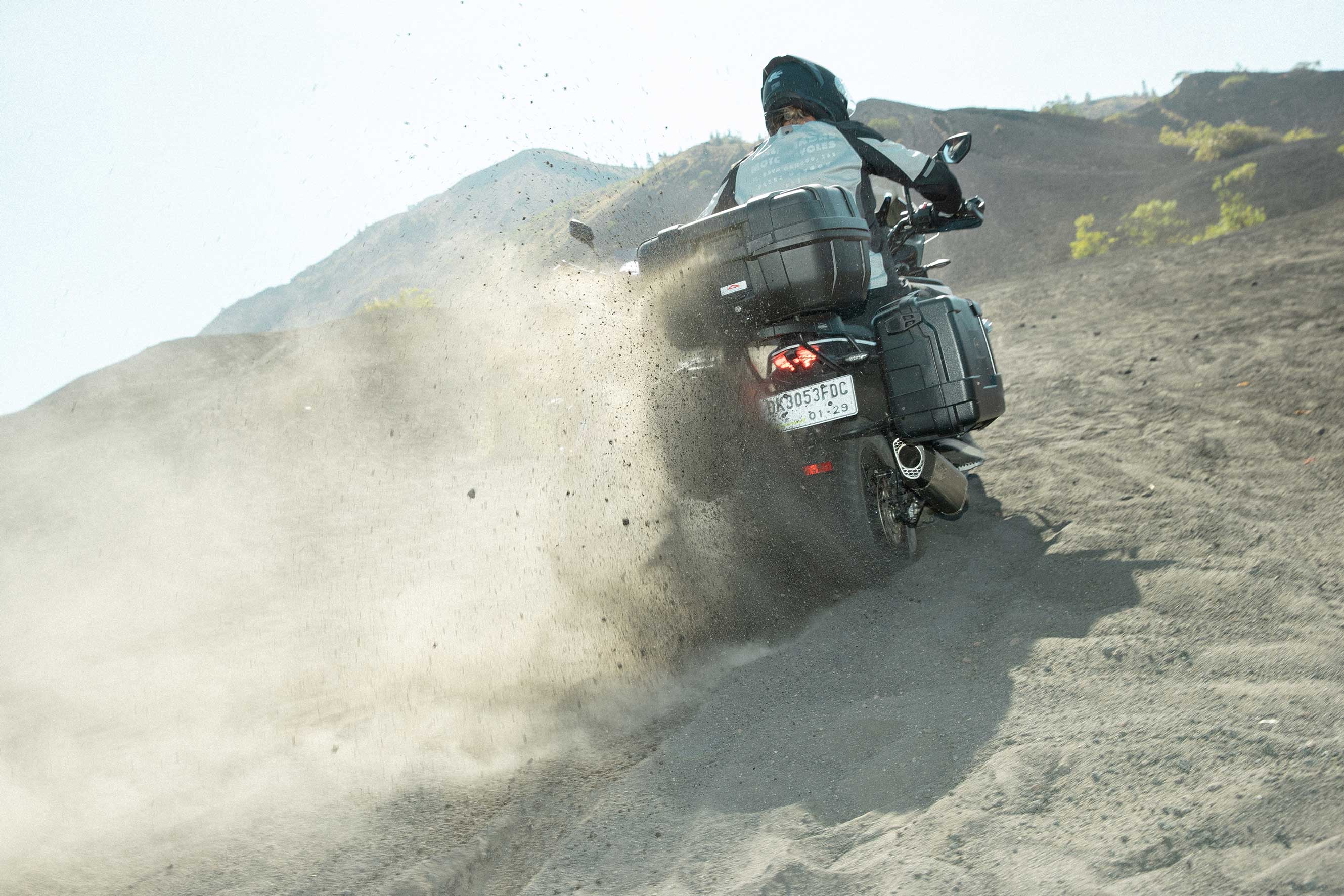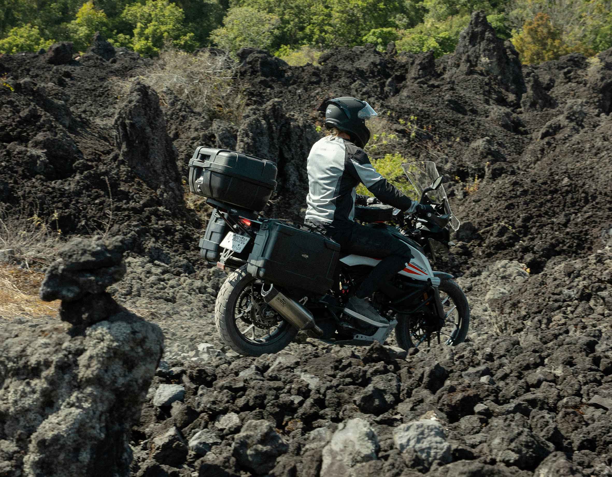 La combinazione fra topcase da 52 litri e laterali asimmetriche da 33 e 46 litri permette di gestire al meglio lo spazio e l’ingombro, adattandosi alle diverse configurazioni di scarico e offrendo una soluzione modulare, acquistabile anche per singoli componenti.