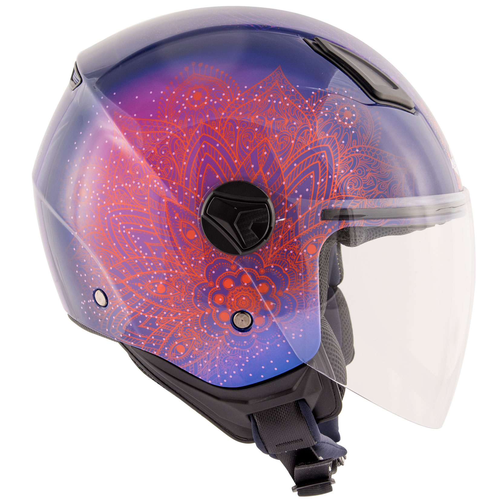 Le linee morbide e intrecciate disegnano una trama armoniosa esaltata da una combinazione cromatica sui toni del rosa e del viola, una scelta insolita nel segmento ma curata e raffinata. Il risultato è un casco dal look esotico e di tendenza, pensato per motocicliste e scooteriste attratte dalle culture del mondo e desiderose di distinguersi nel traffico urbano.