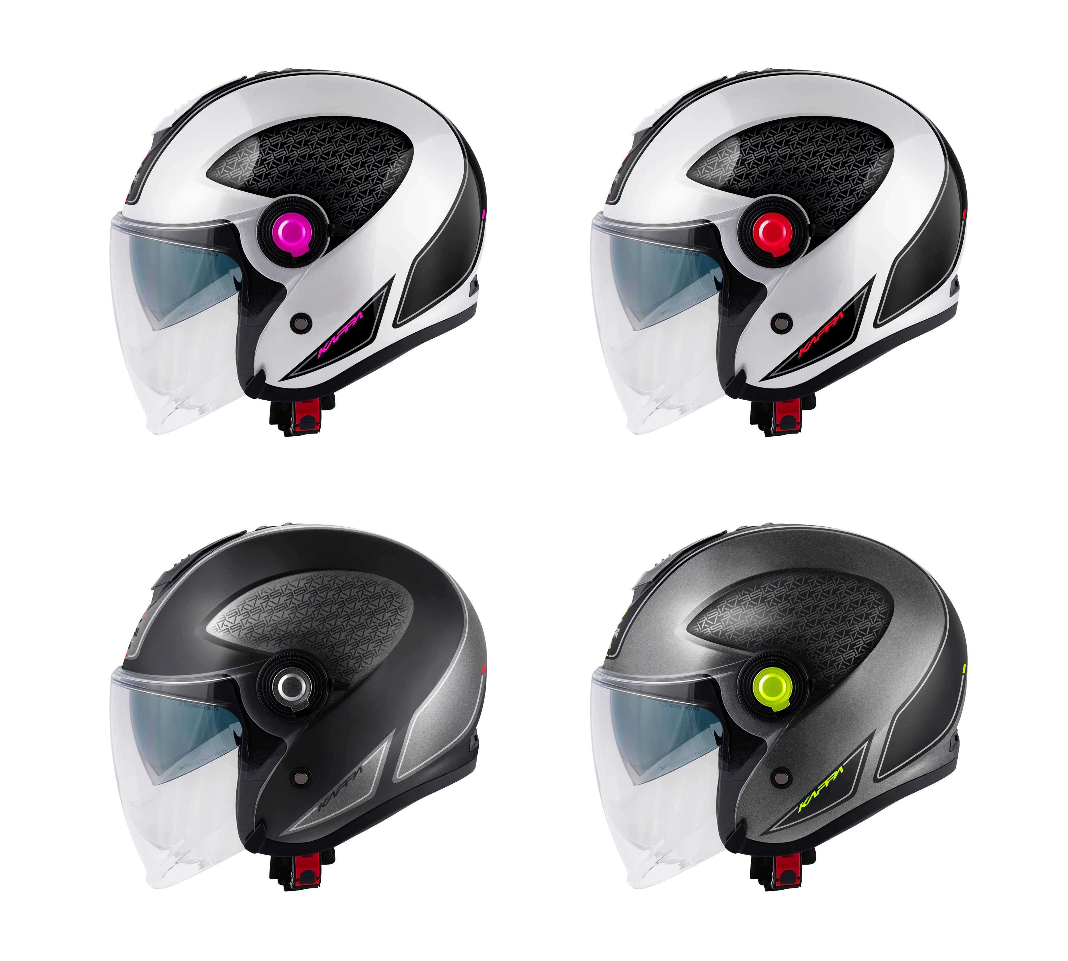 - KV35 DOUBLE VISOR DEXTER: caratterizzato da grafiche minimal ma grintose, abbina tinte neutre come bianco, nero e grigio a dettagli vivaci e fluo, per un look moderno e urbano.