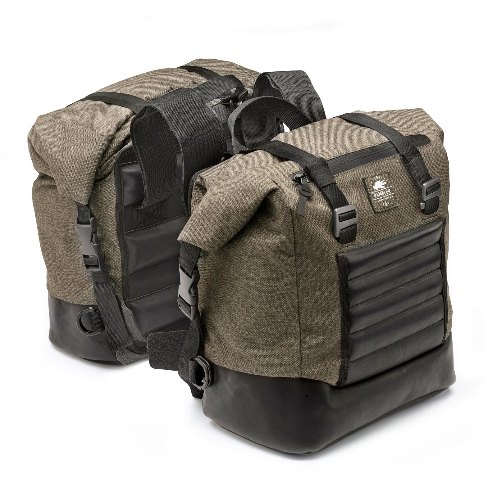 La gamma è composta da quattro borse principali e un borsello porta attrezzi, tutte coordinate per materiali e finiture. Il design punta su un bicolore grigio-verde con inserti in vegan leather nera, per integrarsi con le linee classiche di café racer, scrambler e street bike in stile retrò. Il materiale esterno è in poliestere 550D con rivestimento in PVC, mentre le fodere interne – estraibili e con cuciture nastrate – garantiscono l’impermeabilità dei vani principali.