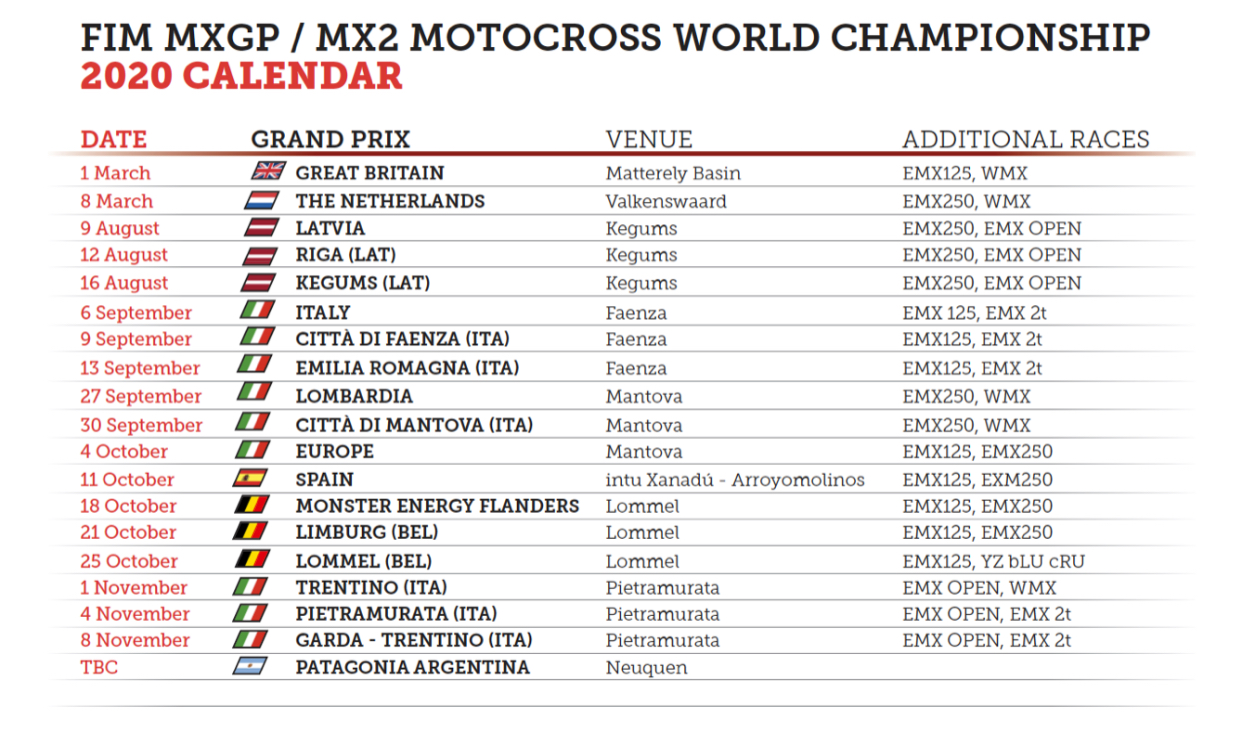 Il calendario prevede un autentico tour de force tra fine settembre e inizio ottobre 2020, con il circus del Mondiale motocross stabilmente di base a Mantova. Il programma delle tre prove è così articolato: