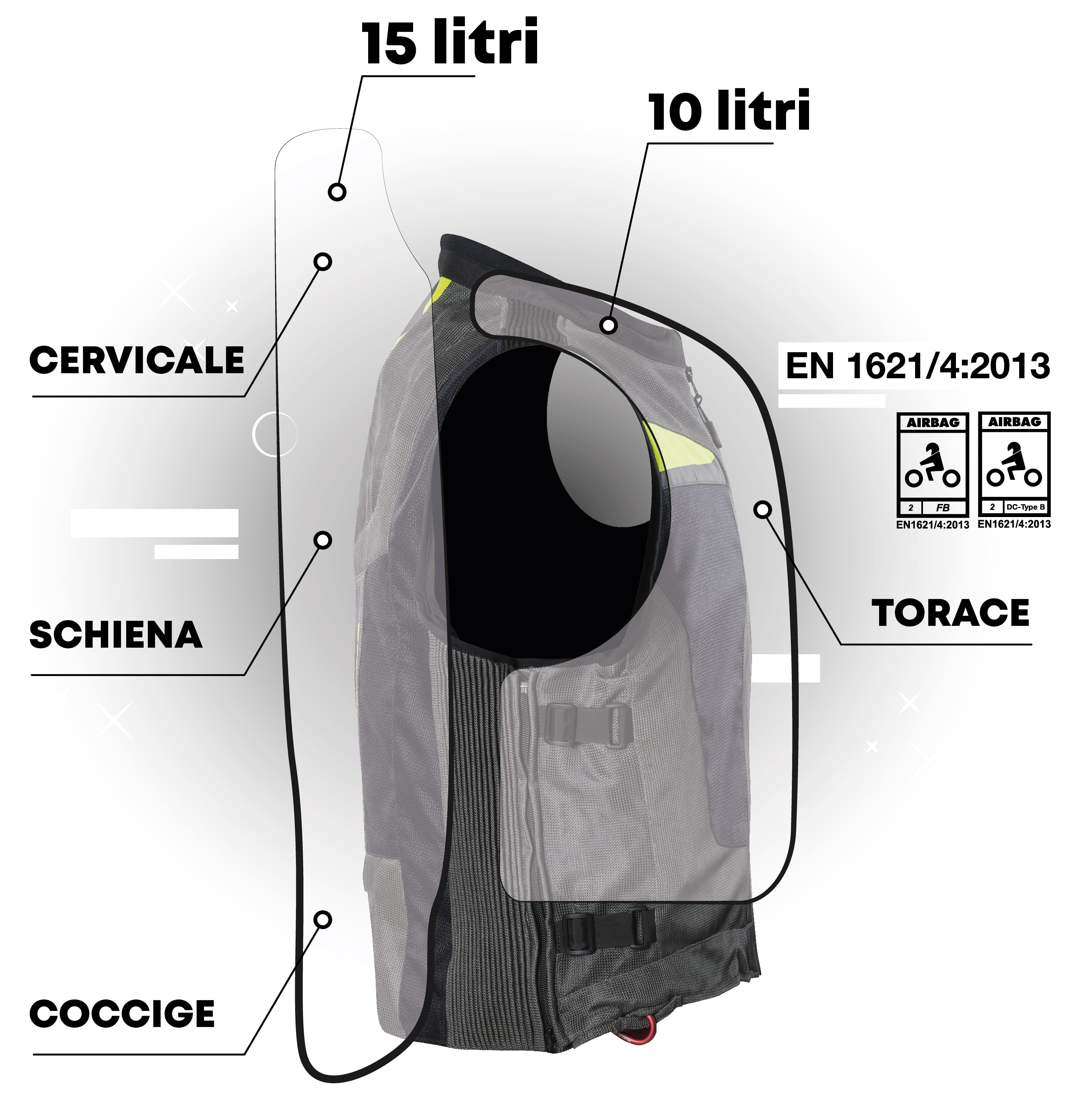 - un primo airbag da 15 litri protegge la zona cervicale (in modo simile a un poggiatesta automobilistico), l’intera schiena fino al coccige
