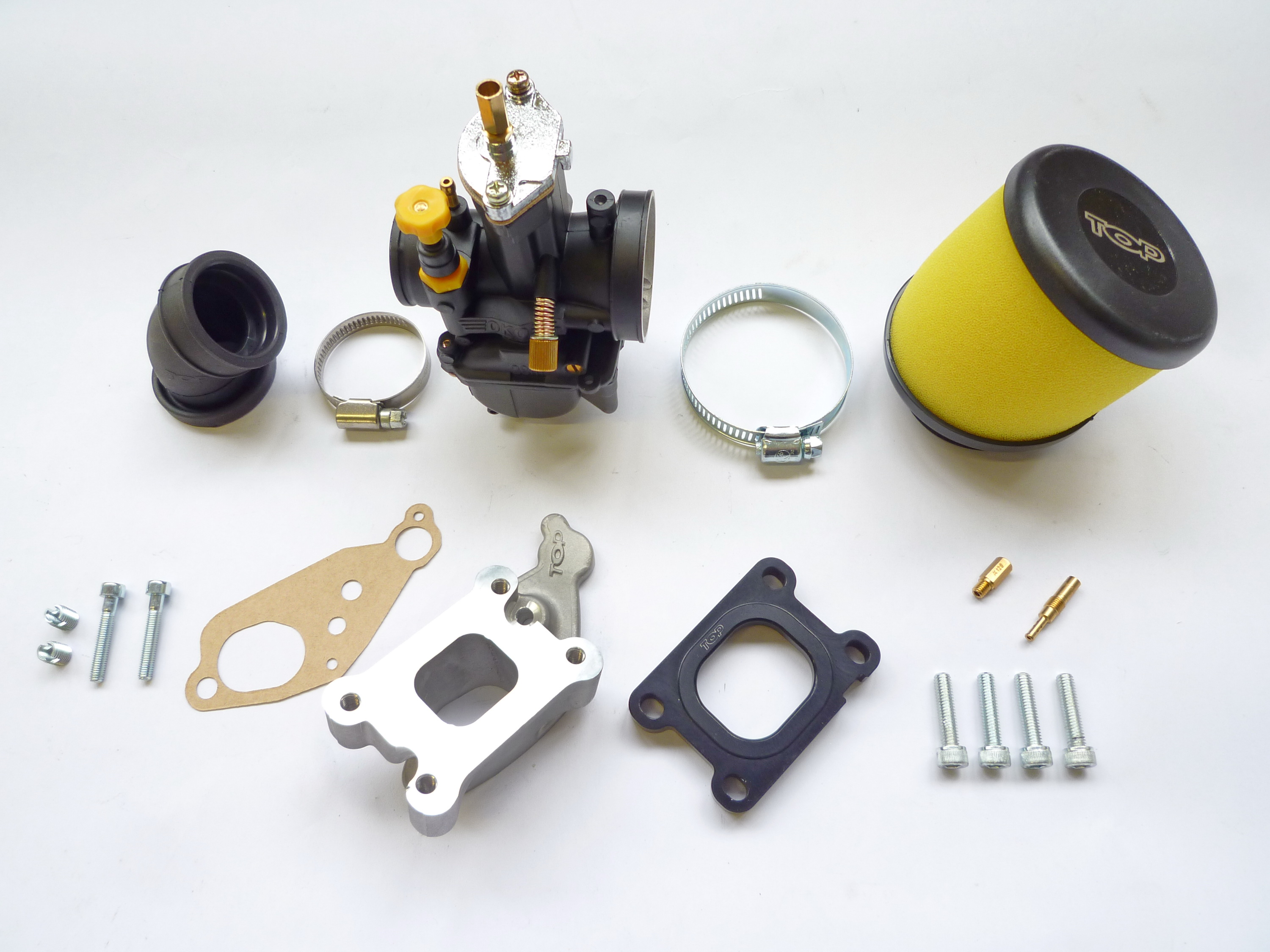 Il kit aspirazione Top Performances con carburatore Oko 28 mm include tutti gli elementi necessari al montaggio sul motore PX, senza richiedere la ricerca di parti aggiuntive. La configurazione è pensata per assicurare compatibilità e affidabilità nell’uso intensivo.