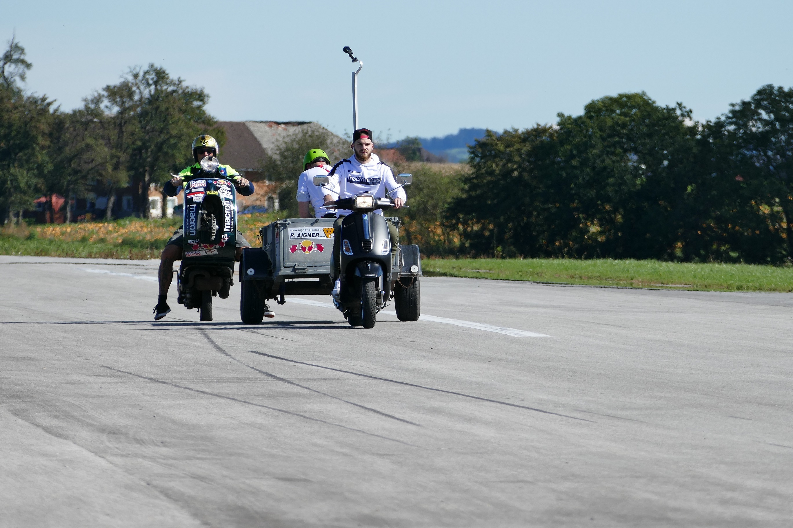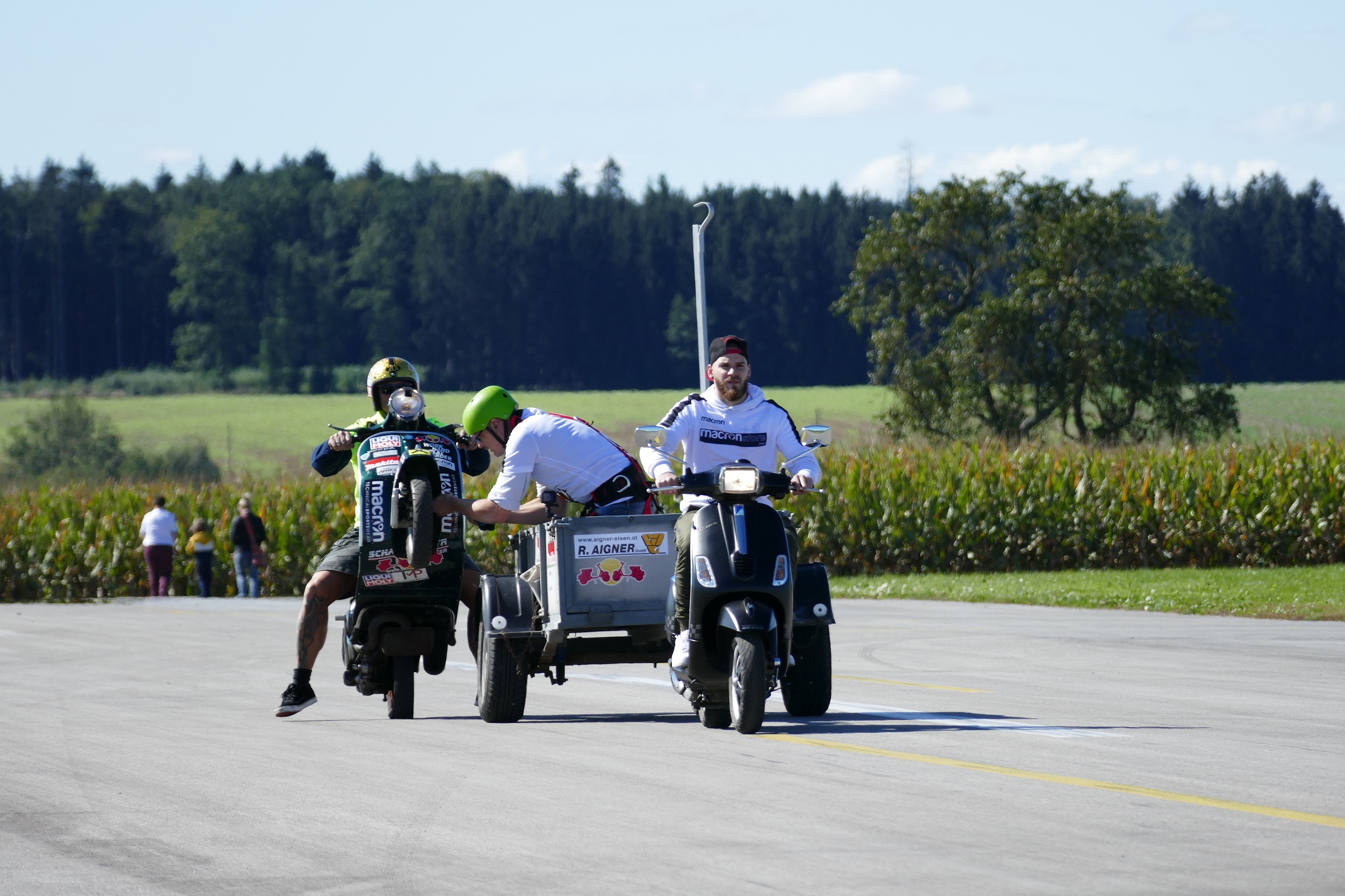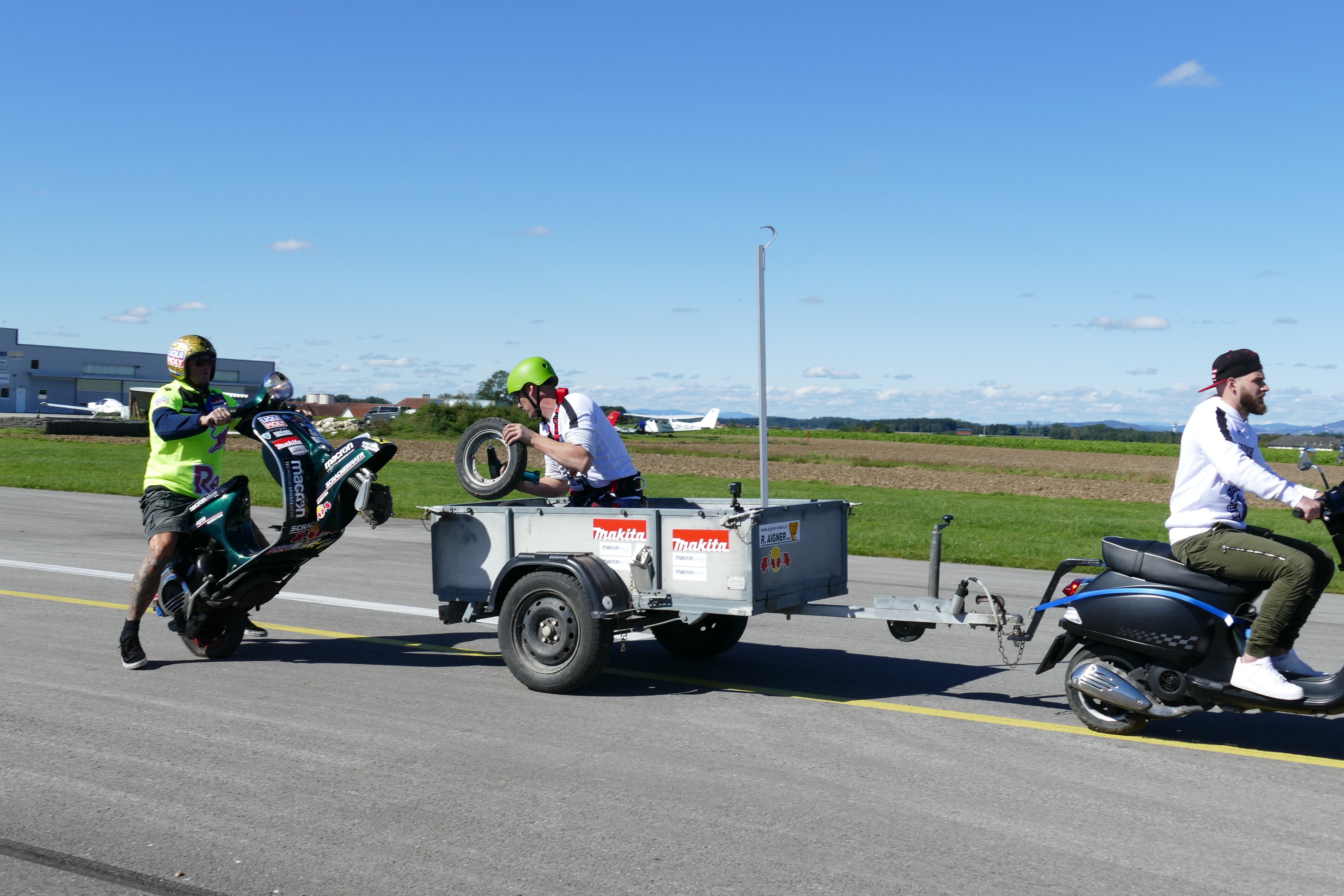Per realizzare la nuova impresa, Schachermayr ha coinvolto una seconda Vespa, incaricata di trainare un carrello sul quale ha preso posto un meccanico. Lo stuntman si è poi messo in sella al proprio scooter, ha sollevato la ruota anteriore e ha affiancato il carrello restando stabilmente in impennata su una sola ruota.