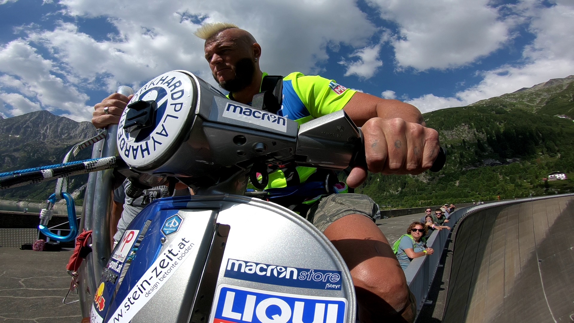 Schachermayr, pendolo da record con la Vespa dalla diga di Schlegeis