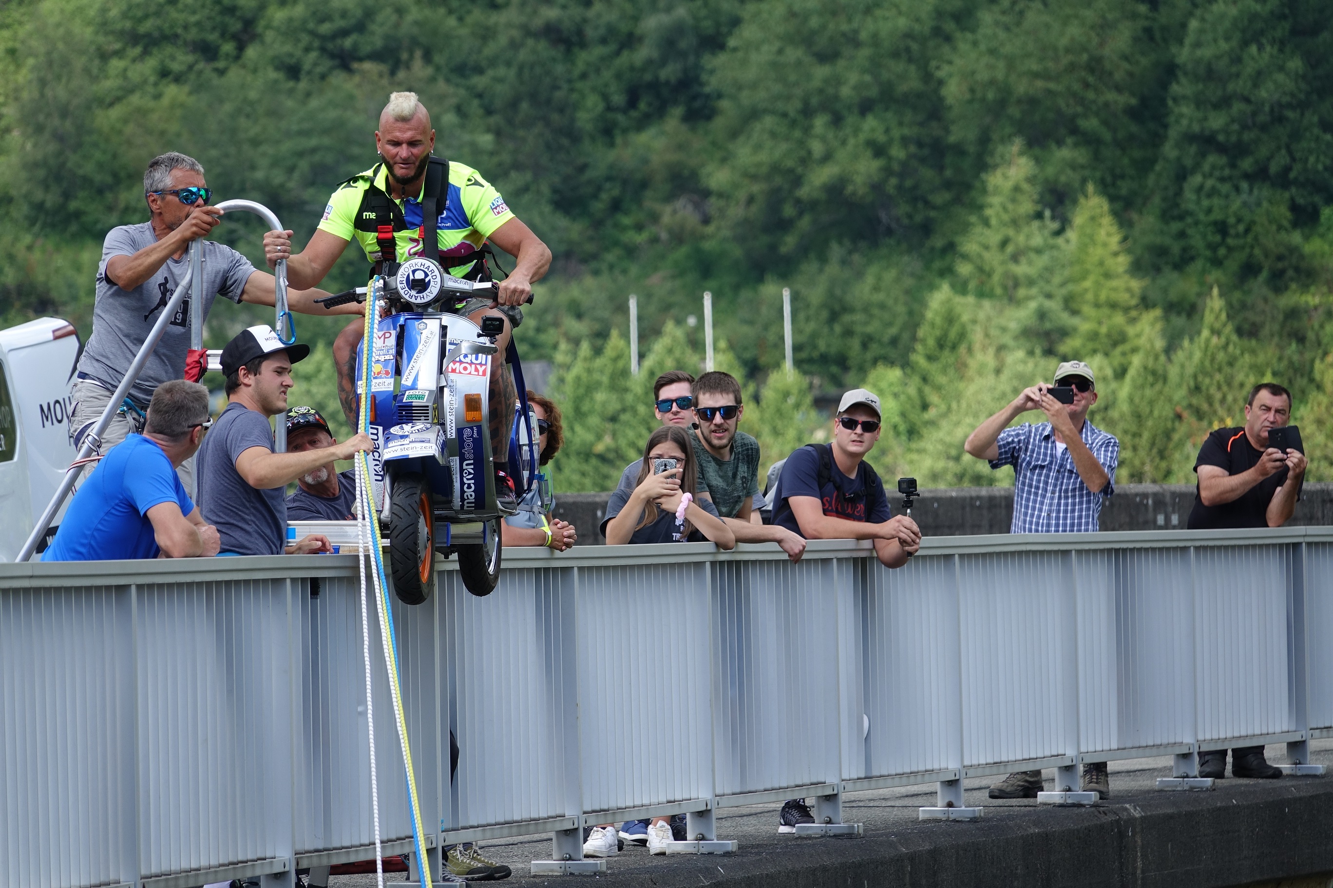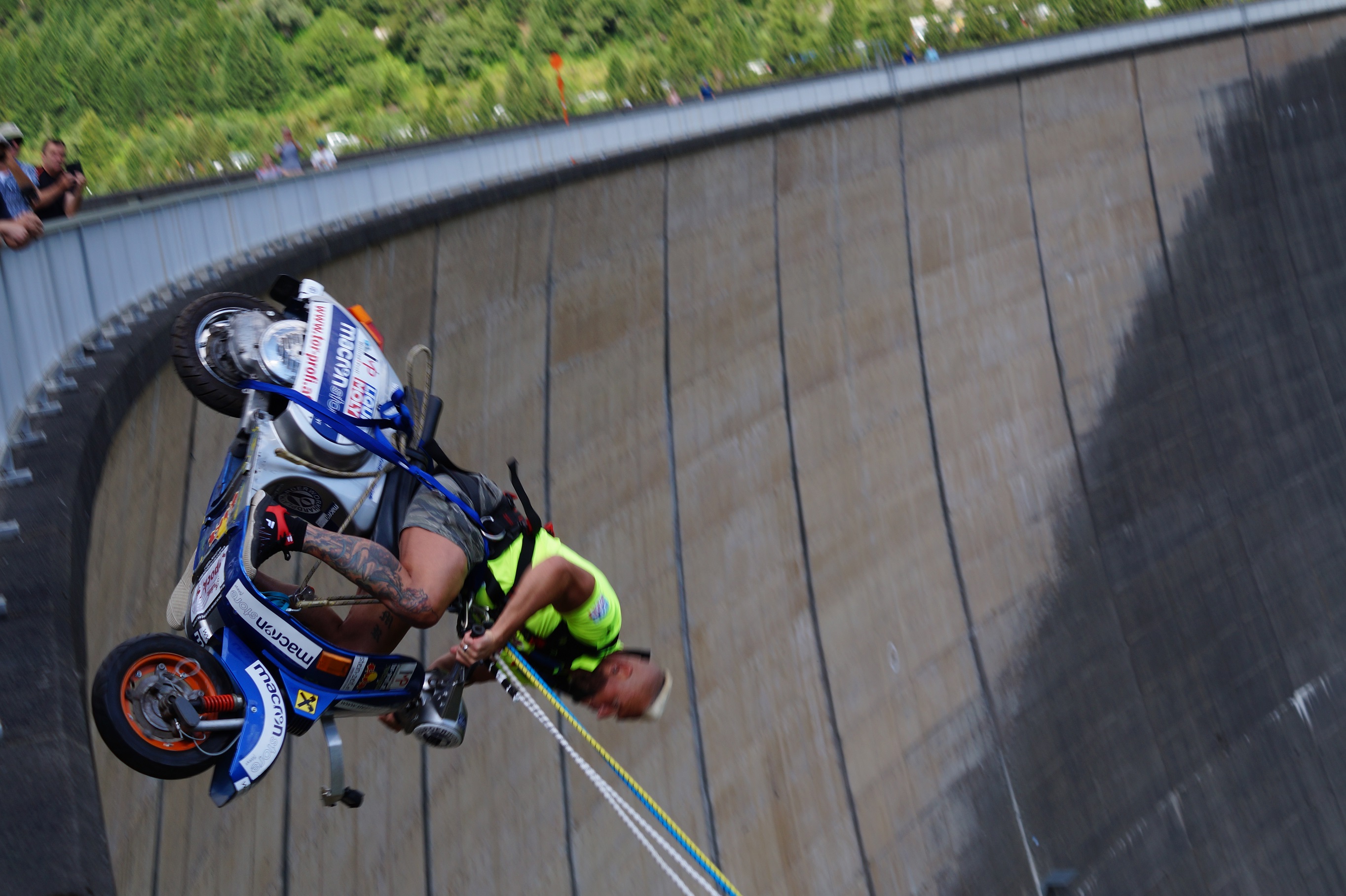 Per affrontare una simile manovra è stato creato un allestimento su misura: una piattaforma dedicata affacciata sulla diga, da cui Schachermayr ha preso il via, e un sistema di corde e cavi progettato espressamente per resistere alle forze in gioco. La Vespa è stata al centro della scena, non come semplice elemento scenografico, ma come parte integrante del sistema di pendolo.