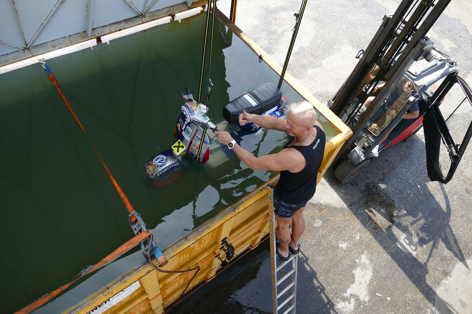Il nuovo obiettivo di Schachermayr era smontare completamente una Vespa PK 50 nel minor tempo possibile, restando in immersione all interno di un enorme contenitore di ferro riempito d acqua fino all orlo.