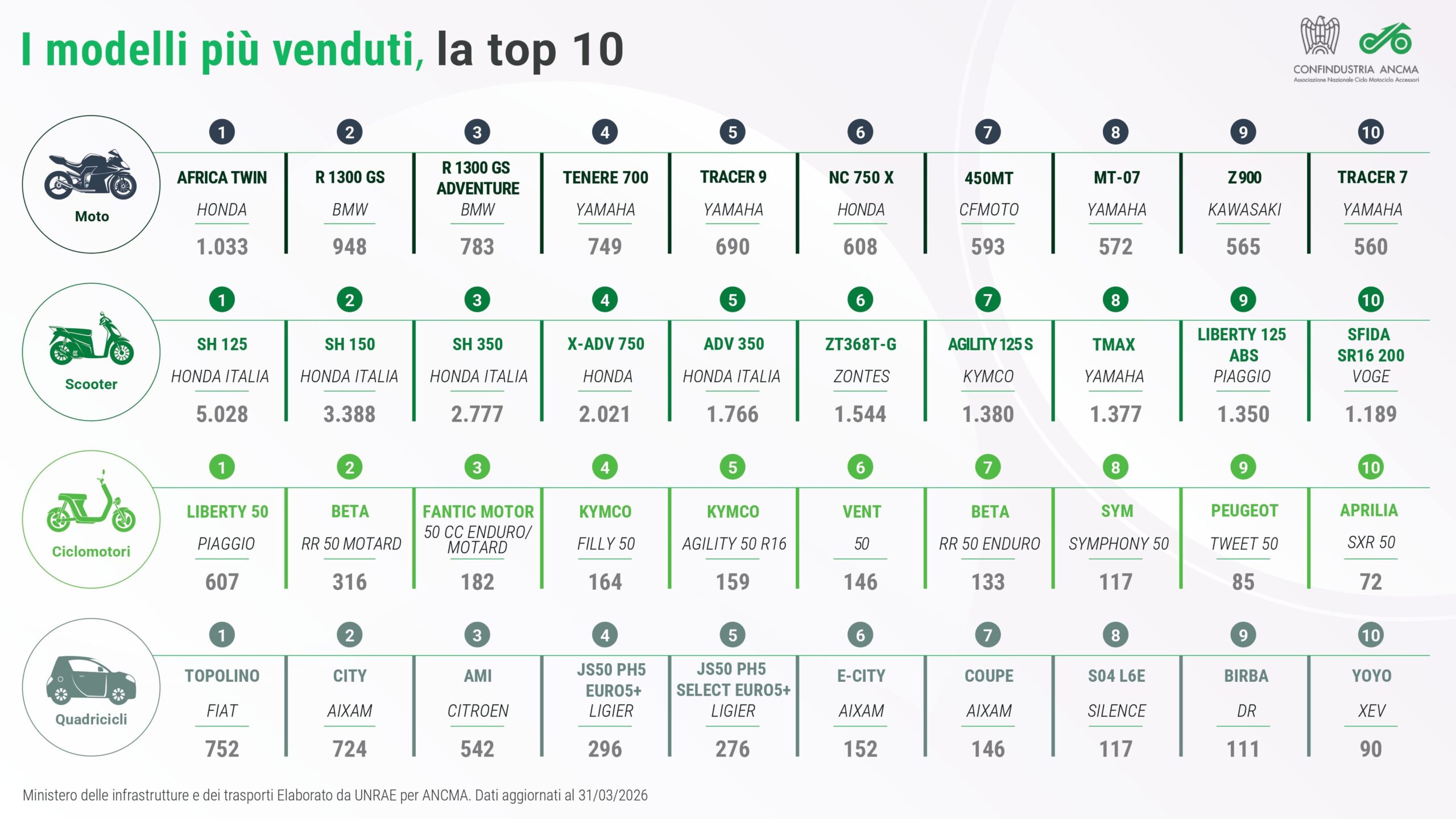 Nel solo mese di marzo, gli scooter crescono del 28,38% e raggiungono 22.664 immatricolazioni, consolidando il loro ruolo di motore principale del settore. Le moto registrano 16.939 pezzi venduti, con una crescita del 14,28%, confermando l’interesse degli appassionati in vista dei mesi primaverili ed estivi.