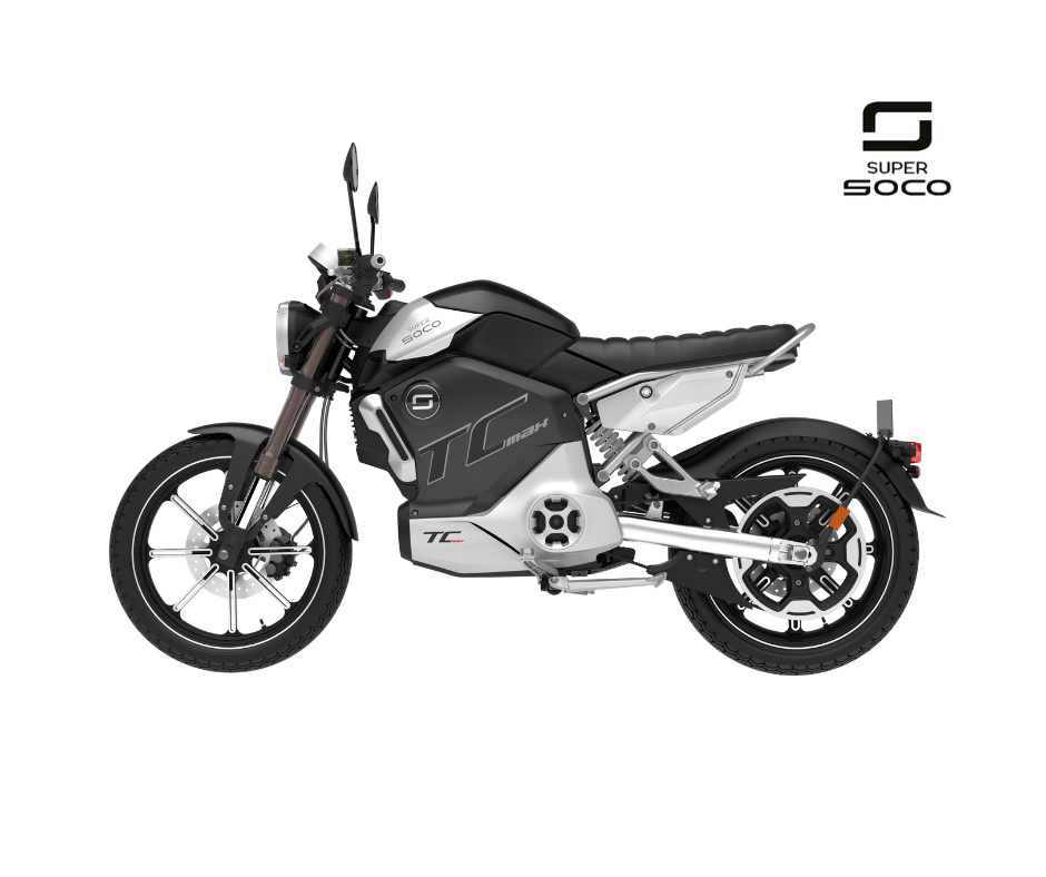 La Super Soco TCmax è il modello di punta, con motore centrale da 3.000 W alimentato da batteria al litio da 72V 45Ah (3.240 Wh) estraibile. Raggiunge una velocità massima di 100 km/h e dichiara un’autonomia di 110 km a 45 km/h, con tempi di ricarica compresi tra 3 e 6 ore. Il telaio principale è in acciaio al carbonio con sotto-telaio in alluminio, ruote da 17 pollici, sistema di frenata combinata con pinza a tre pistoni all’anteriore e singolo pistone al posteriore, peso di 100 kg. Di serie l’illuminazione full LED con faro adattativo e display LCD.