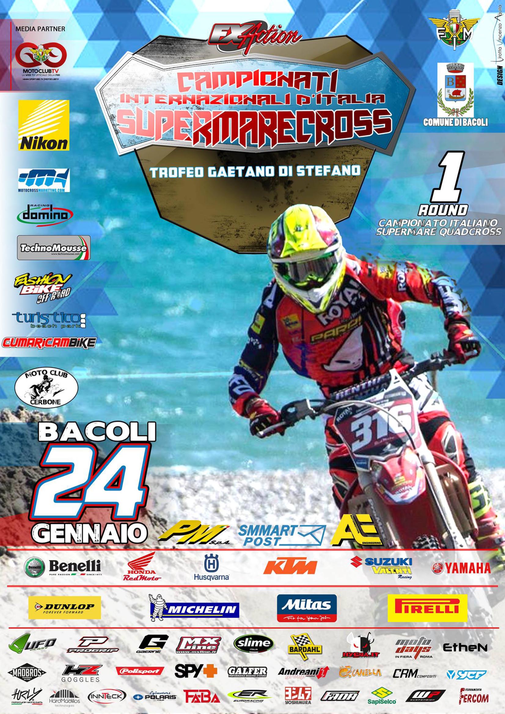 Il Supermarecross 2016 prende il via dalla spiaggia di Bacoli-Miliscola, alle porte di Napoli, riportando in Campania gli Internazionali d’Italia su sabbia dopo quattro anni di assenza. La tappa inaugurale del 24 gennaio apre una stagione che unisce spettacolo, turismo balneare e grande motocross, con l’aggiunta del Campionato Italiano Supermare Quadcross.
