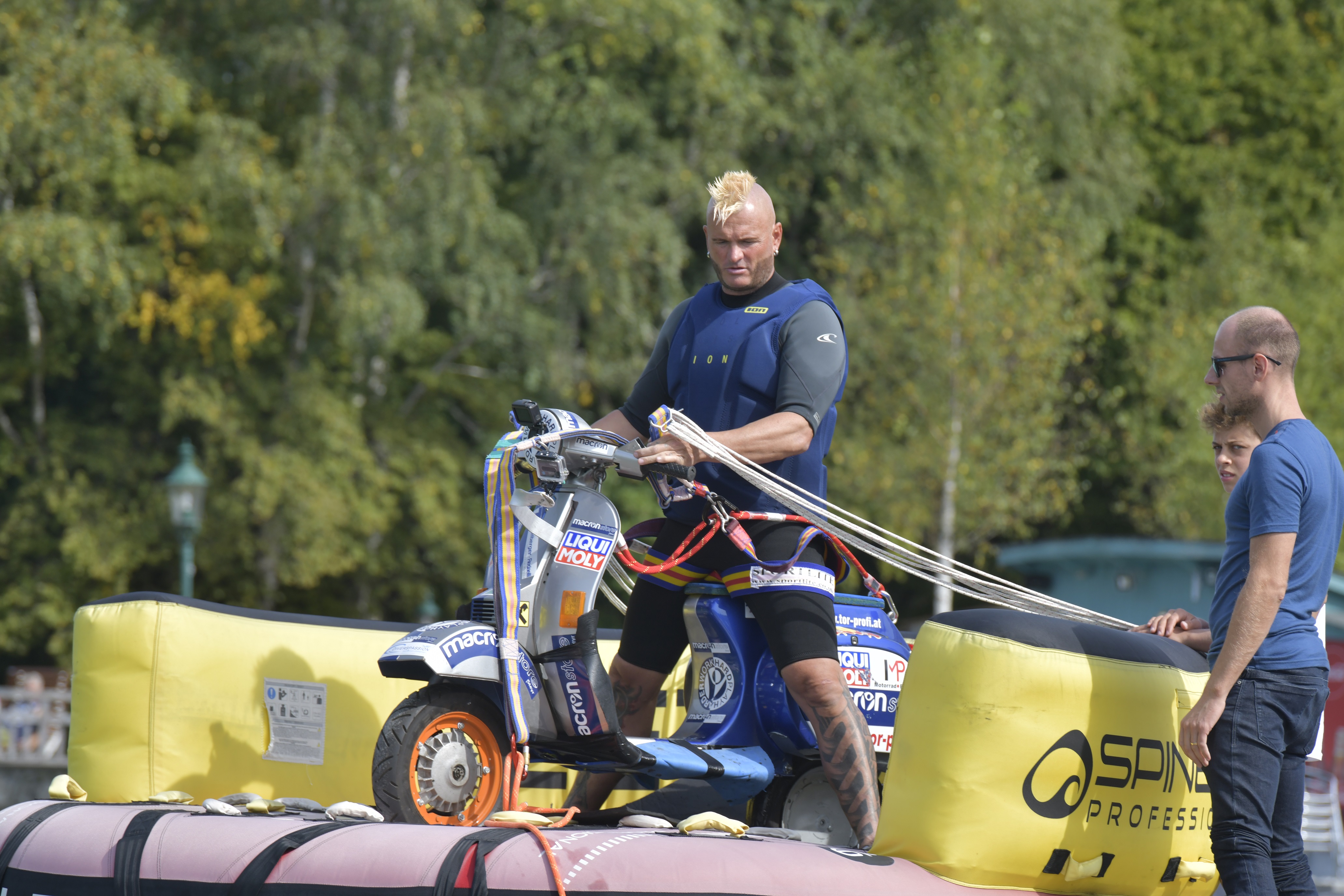 Al momento della partenza, il peso complessivo del sistema Vespa-pilota, pari a circa 145 kg, si è rivelato eccessivo per le condizioni del vento. Nel tentativo di staccare dall’acqua, Schachermayr ha toccato violentemente la superficie del lago con lo scooter, riportando una lacerazione alla caviglia destra che lui stesso ha dichiarato di aver notato solo al termine del tentativo.