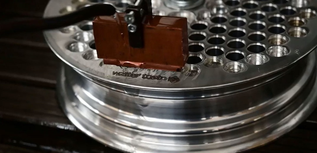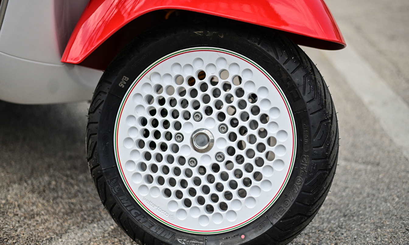 Uno degli elementi più scenografici di Vespamorino sono i cerchi, interamente ridisegnati e ricavati dal pieno. Ciascun cerchio nasce da un blocco di metallo di 30 chilogrammi, lavorato con processi industriali avanzati mutuati dalle attività core di Walter Tosto. Dopo il trattamento termico in forno e le finiture, ogni cerchio arriva a pesare circa un decimo del grezzo iniziale, fermandosi a 3,75 chilogrammi.